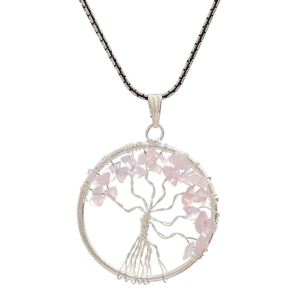Rose Quartz Pendant Tree of Life Crystal Stone Pendant Locket with Metal Chain for Healing Crystal Healing Gemstone Size 35-40 mm rose quarts
